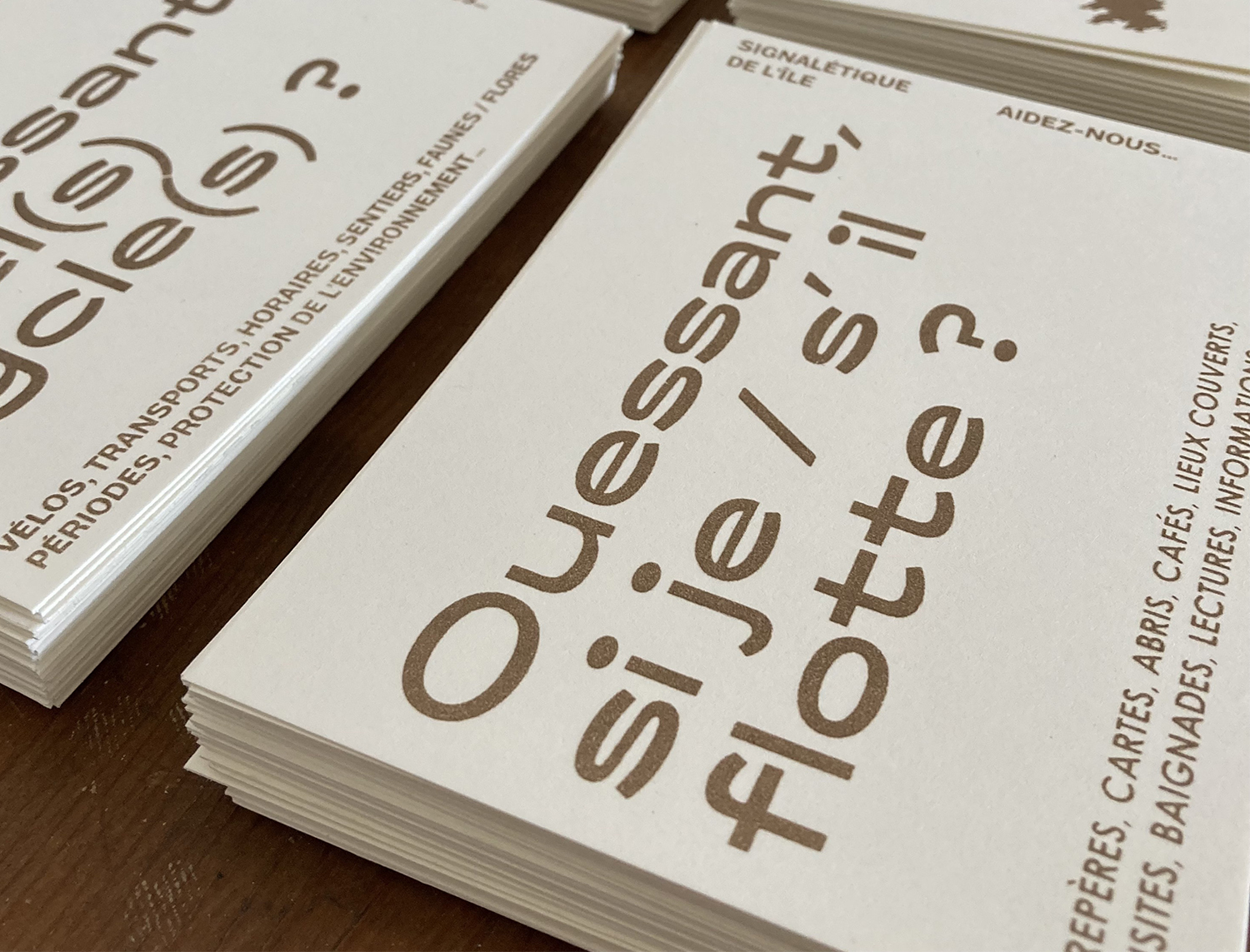 La mairie d’Ouessant et l’Office de tourisme souhaitent faire évoluer la signalétique touristique de l’île (aujourd'hui quasi inexistante). Soutenus par la Région Bretagne dans le cadre du dispositif ≪Site d’Exception≫, ils ont mandaté en 2021 une équipe de paysagistes, graphiste, designer et pour les accompagner dans ce projet.