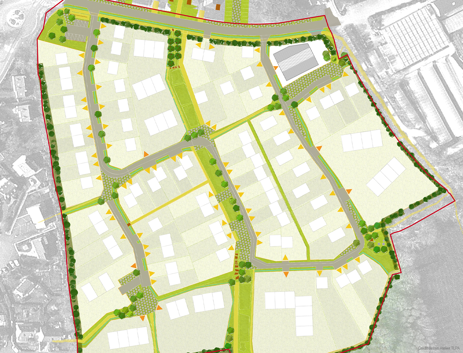 Le choix a été fait de gérer les eaux de pluies de manière intégrée (avec l’expertise d’Infraservices) ce qui oriente l’aspect des espaces publics : des espaces verts « creux », des noues ou fossés le long de chaque route (routes ouvertes à la circulation ou sentiers piétons). Ces aménagements ont une fonction précise pour la gestion des eaux, ils seront traités et plantés en conséquence. Ils participent grandement à l’ambiance du futur quartier.