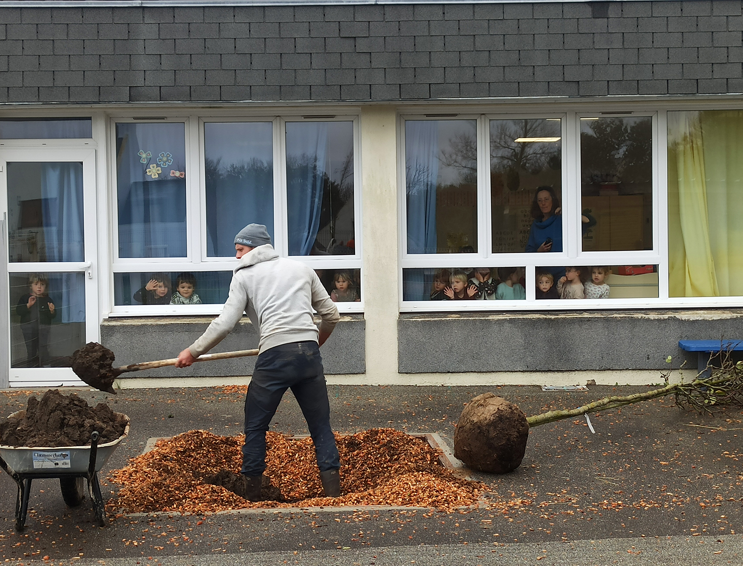 Ateliers avec les enfants et l’équipe pédagogique de la phase de diagnostic jusque la réalisation pour co-construire ensemble le projet. Réalisation des travaux par les services techniques de la commune ; réorganisation des cours et requalification de leurs limites, création d’un amphithéâtre de verdure, décroutage de l’enrobé et création de fosses de plantations, implantation de clôtures bois autour du terrain de foot... Réalisation de mobiliers sur-mesure et de peintures au sol ludiques par Clément Bouldoires, menuisier, et Erwan Bloc’h, artiste peintre de la commune.